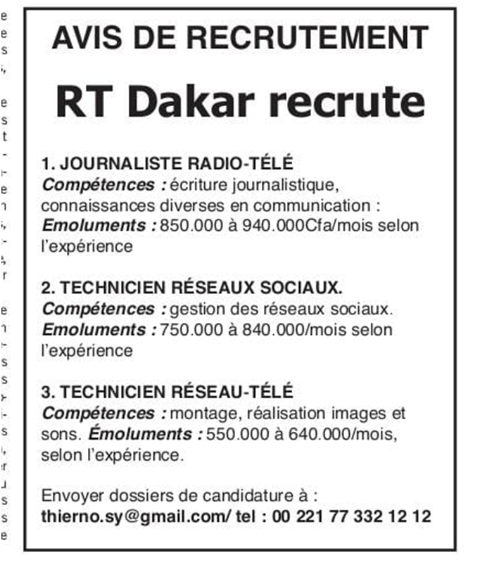 Ledit communiqué parle d’un supposé avis de recrutement émis par RT Dakar pour les postes de « Journalistes radio – télé, techniciens de réseaux sociaux et techniciens réseau – télé ». Les émoluments, une adresse mail et un numéro de téléphone constituent le complément d’informations que l’on retrouve dans le prétendu avis de recrutement.