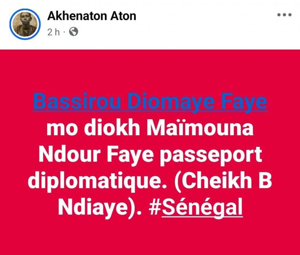 Le 20 novembre 2025, la publication faite sur la page Akhenaton Aton est rédigée en wolof, langue nationale au Sénégal et dit ceci: « Bassirou Diomaye Faye mo diokh Maïmouna Ndour Faye passeport diplomatique. (Cheikh B Ndiaye) ». En français, cela signifie: « Bassirou Diomaye Faye a octroyé un passeport diplomatique à Maïmouna Ndour Faye, selon Cheikh B Ndiaye ».