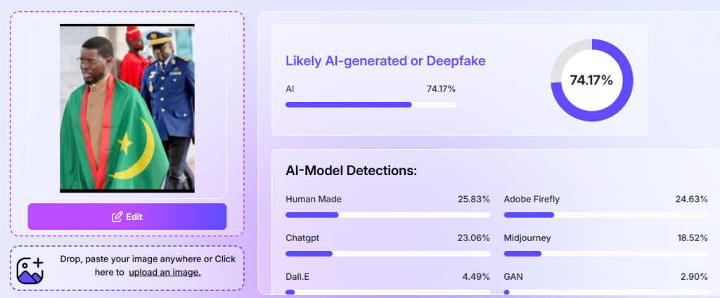 Ils ont par la suite analysé la photographie avec reversaly.ai, un outil qui permet de détecter si les images ont été ou non, générées par l’Intelligence Artificielle et ont obtenu un résultat de 74,17%.