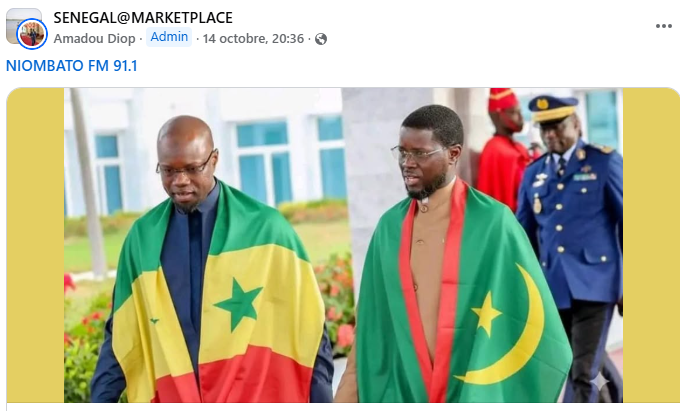 La publication qui a été faite le 14 octobre 2025 présente une photo de Bassirou Diomaye Faye, le Chef de l’État sénégalais, qui a le drapeau de la Mauritanie sur ses épaules et Ousmane Sonko, son premier ministre, qui, quant à lui, a le drapeau du Sénégal. Les deux marchent côte à côte et derrière eux, on voit notamment un gendarme. Cette publication a aussi été partagée ici et ici.