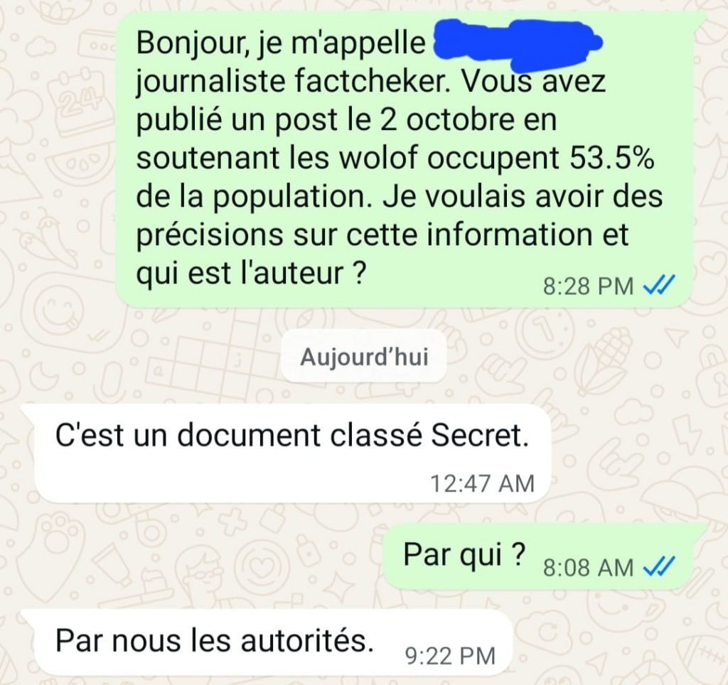Les vérificateurs des faits ont contacté par mail, puis par WhatSapp via ce numéro +220 945 4455 qui a un indicatif de la Gambie, l’un des administrateurs de la page qui a affirmé que « C’est un document classé secret par les autorités ». Voir capture d’écran ci – dessous: