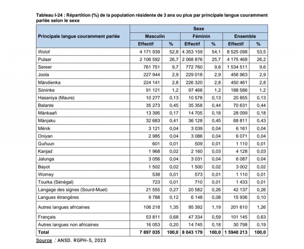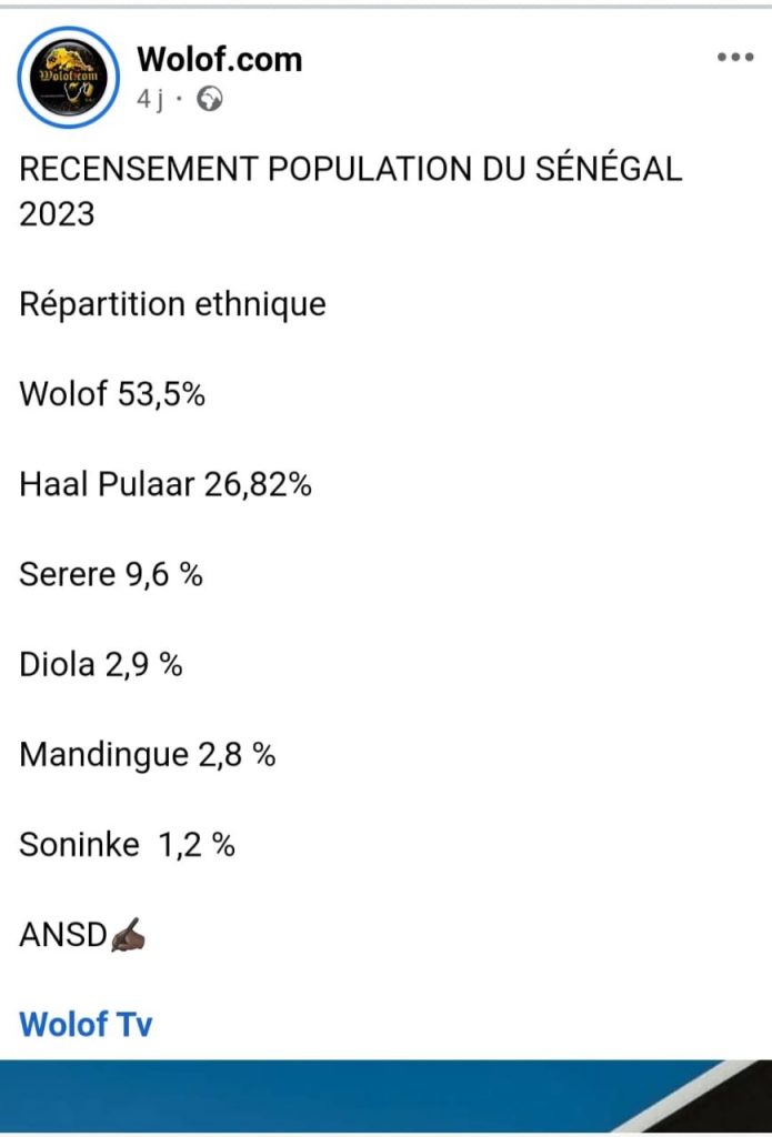 Le 2 octobre 2025, Wolof.com (Na Nga Def) fait un post et écrit ceci: « Recensement de la population du Sénégal 2023. Répartition ethnique – Wolof 53,5% – Haal Pulaar 26,82% – Serere 9,6 % – Diola 2,9 % – Mandingue 2,8 % – Soninke 1,2 % ».