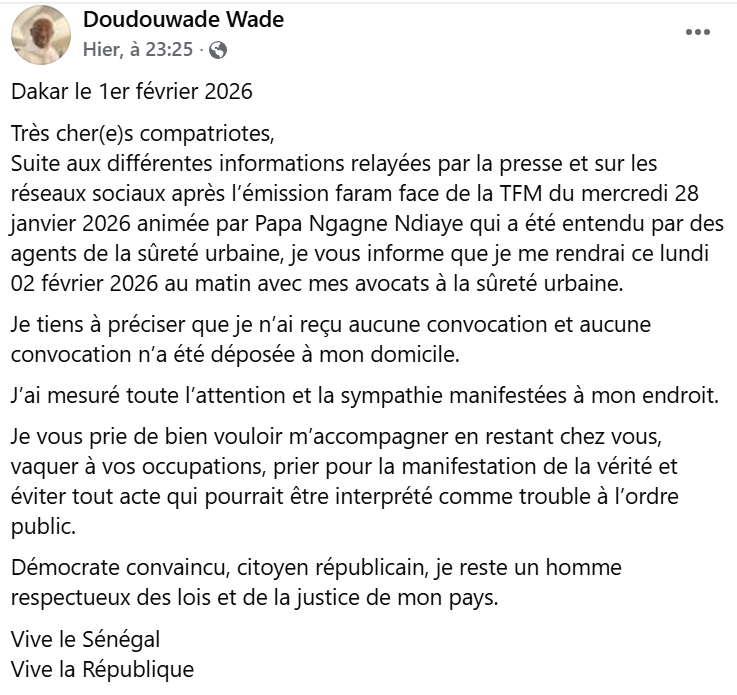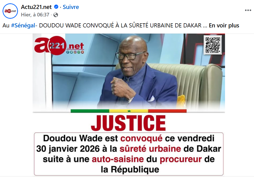 La publication qui date du samedi 31 janvier 2026 et qui a été postée sur la page Actu 221 dit ceci : « Doudou Wade est convoqué ce vendredi 30 janvier 2026 à la Sûreté urbaine de Dakar suite à une auto-saisine du procureur de la République ». Elle met en avant une photo de l’ancien député en interview à la TFM.