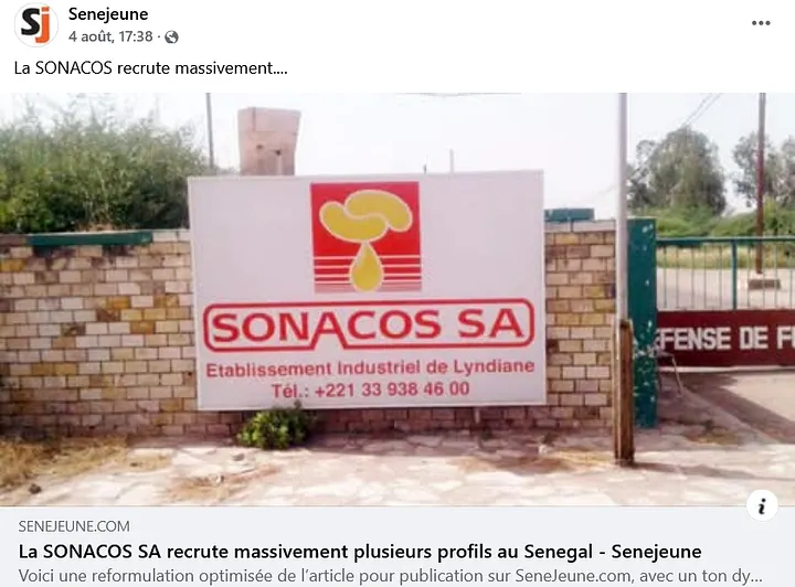 Ce post Facebook contenant un lien vers un site Web affirmant que la Société Nationale de Commercialisation des Oléagineux du Sénégal (SONACOS SA) recrute pour divers postes est FAUX.