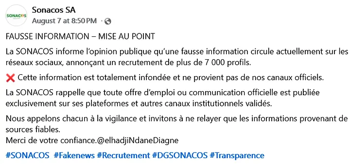 PesaCheck a joint au téléphone Aminata Thiam, Cheffe de service communication chez SONACOS SA qui a apporté un démenti à l’avis d’embauche contenu dans l’article : « Ce recrutement est faux et ne provient pas de notre société ».