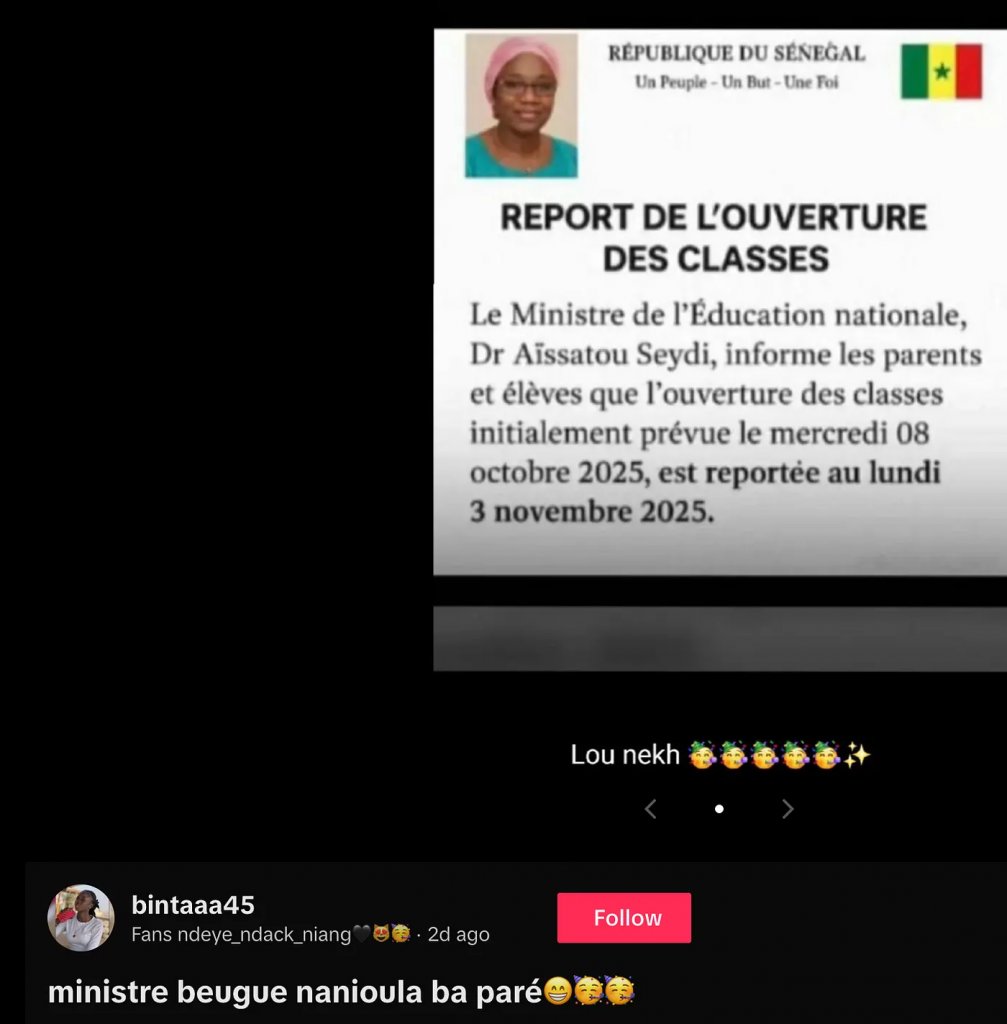 Cette publication sur TikTok, prétendant annoncer le report de l’ouverture des écoles au Sénégal pour l’année scolaire 2025–2026, est FAUSSE.